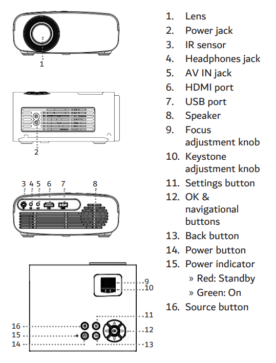 AV (3.5 mm → RCA): Plug into the AV port, select AV, and press OK.