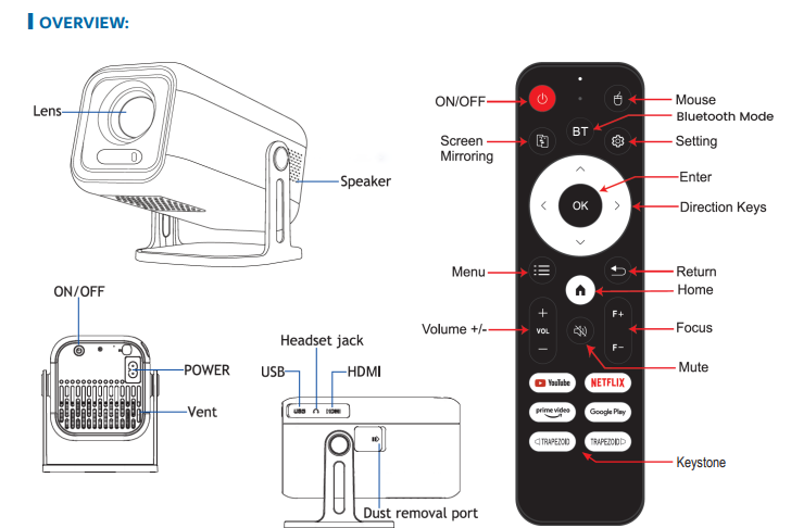 The remote control for the Laser Smart Projector Outdoor Cinema 144 inch includes buttons for: