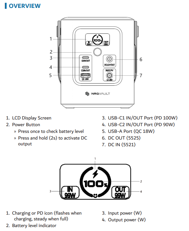 These indicators help you monitor performance and power usage on the NRGVault 100W Portable Power Station.